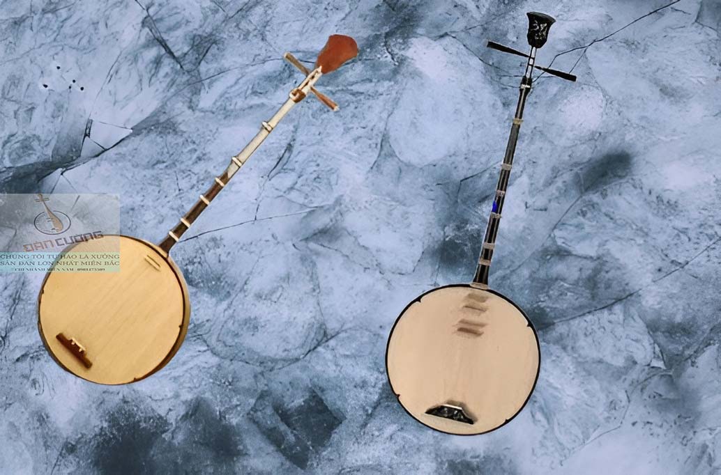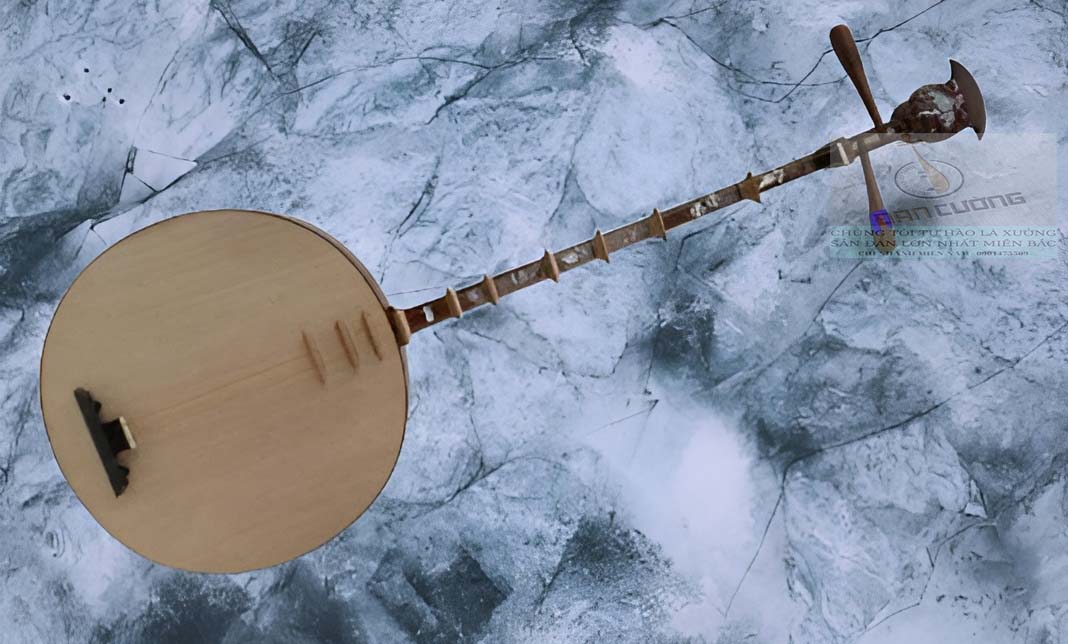 – Bầu vang: Bộ phận hình tròn ống dẹt, đường kính mặt bầu 30 cm, thành bầu 6 cm. Nền mặt bầu vang có bộ phận nằm phía dưới gọi là ngựa đàn (cái thú) dùng để mắc dây. Bầu vang không có lỗ thoát âm.